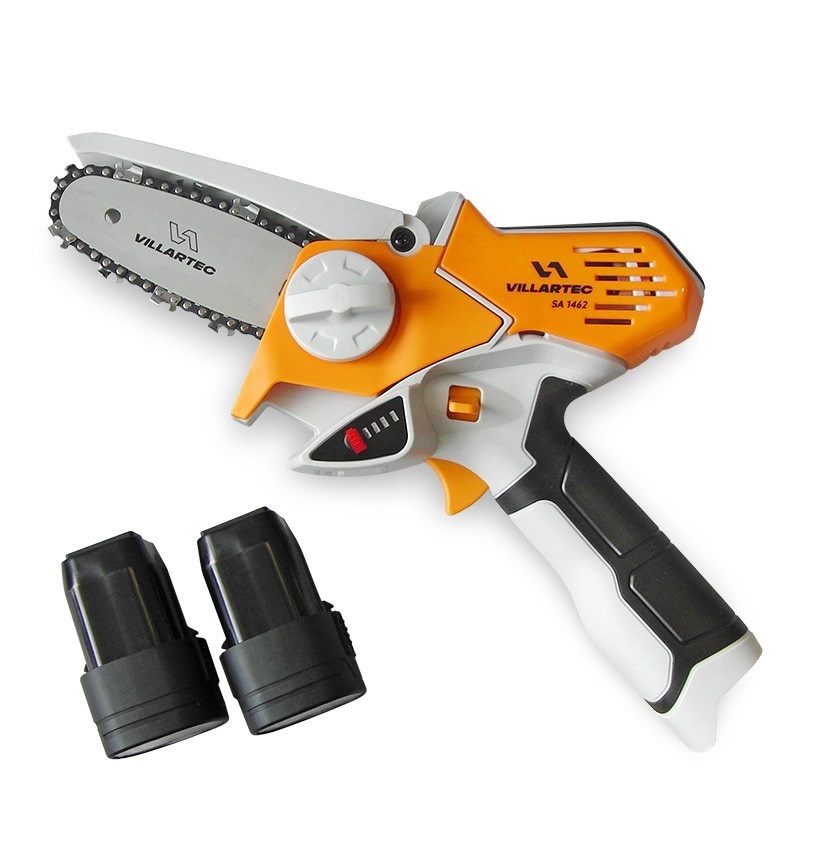 Универсальный аккумуляторный сучкорез. Для обрезки деревьев и кустарников или столярных работ. Пильная цепь PM3 1/4'' гарантирует высокую производительность реза. Эргономичная прорезиненная рукоятка. Безынструментальная замена цепи, подвижный кожух для безопасной работы, индикатор уровня заряда.